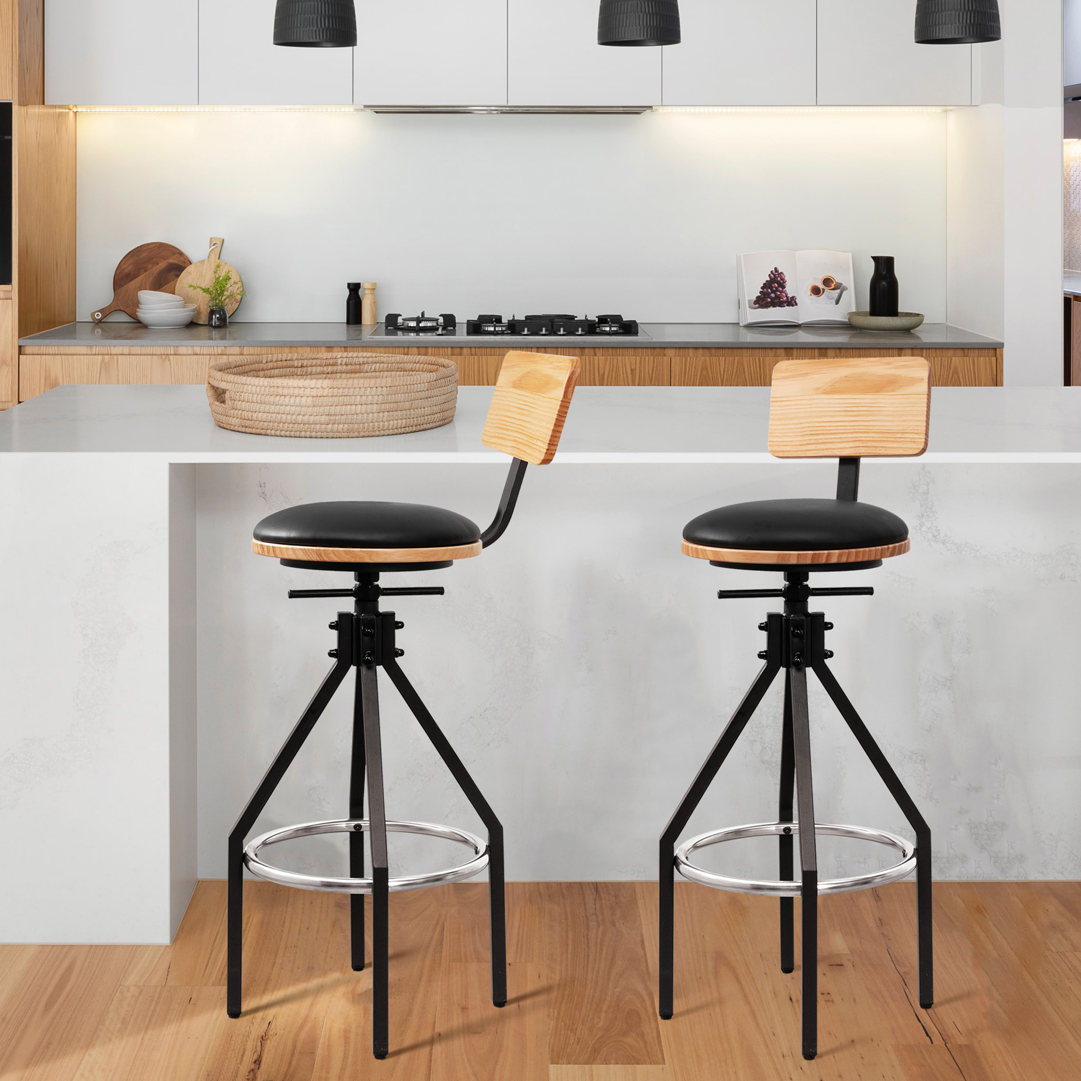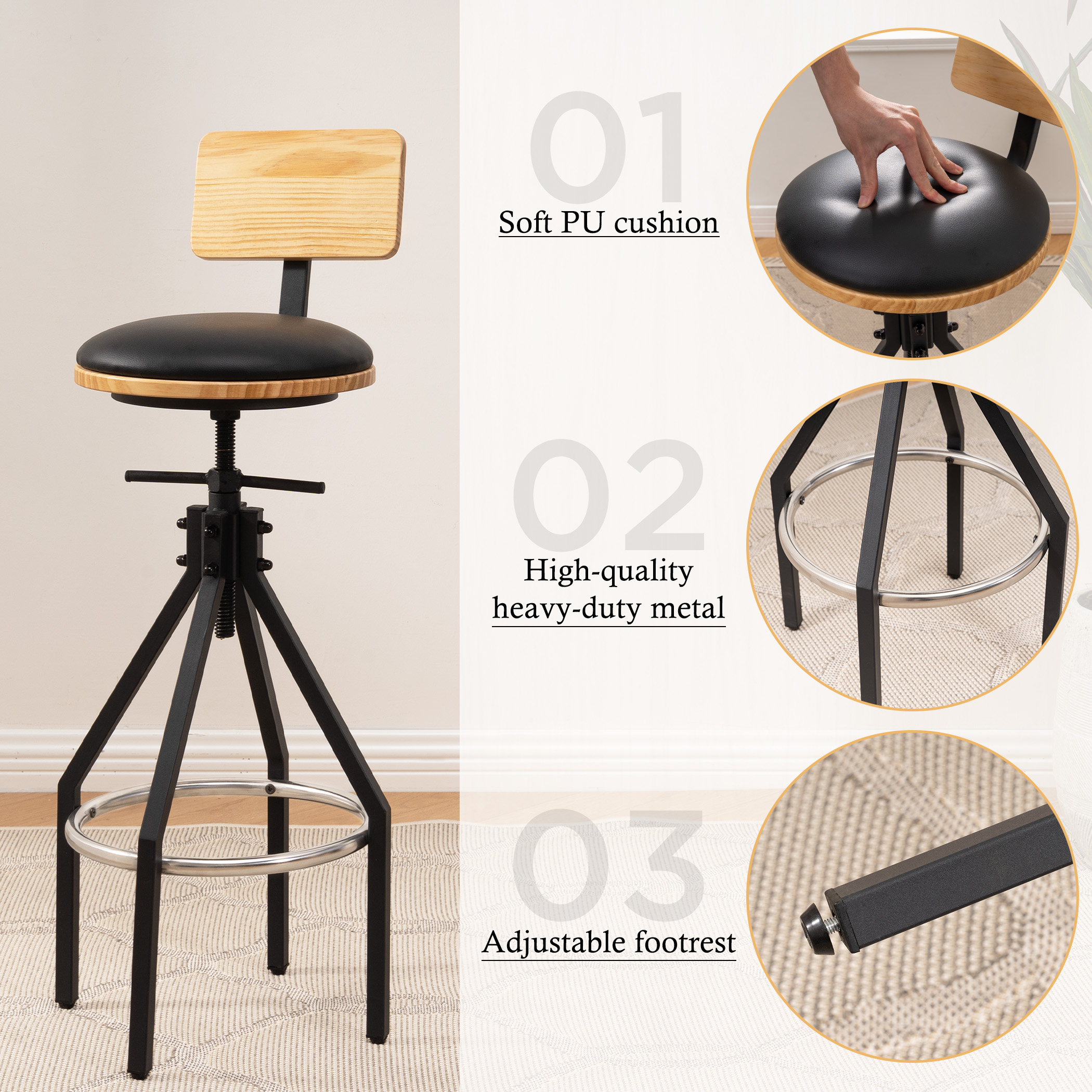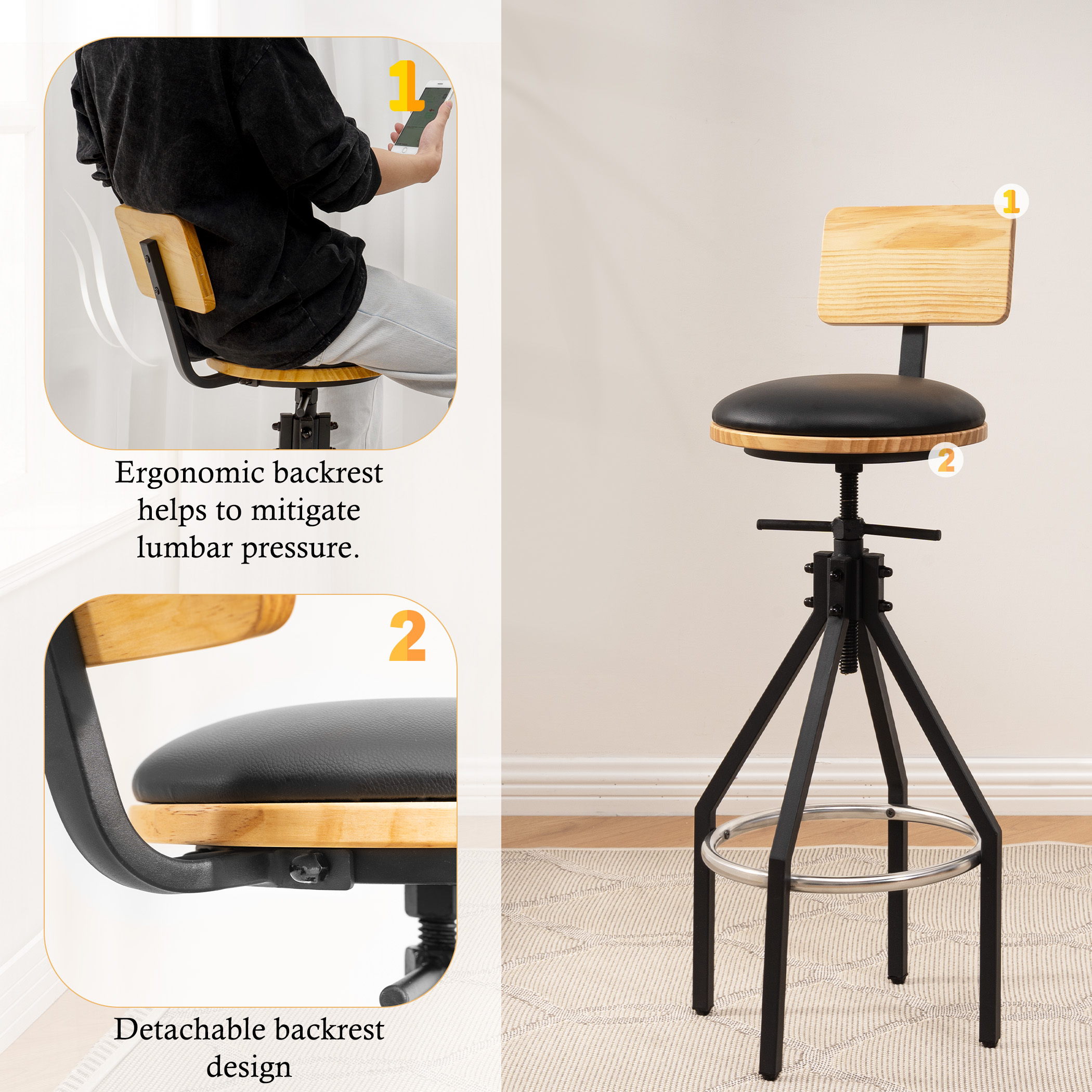 Detachable Ergonomic Backrest – Ergonomic backrest helps to relieve pressure on your lumbar, or you may remove it when you don’t need it to change the bar stool in a brand new style.