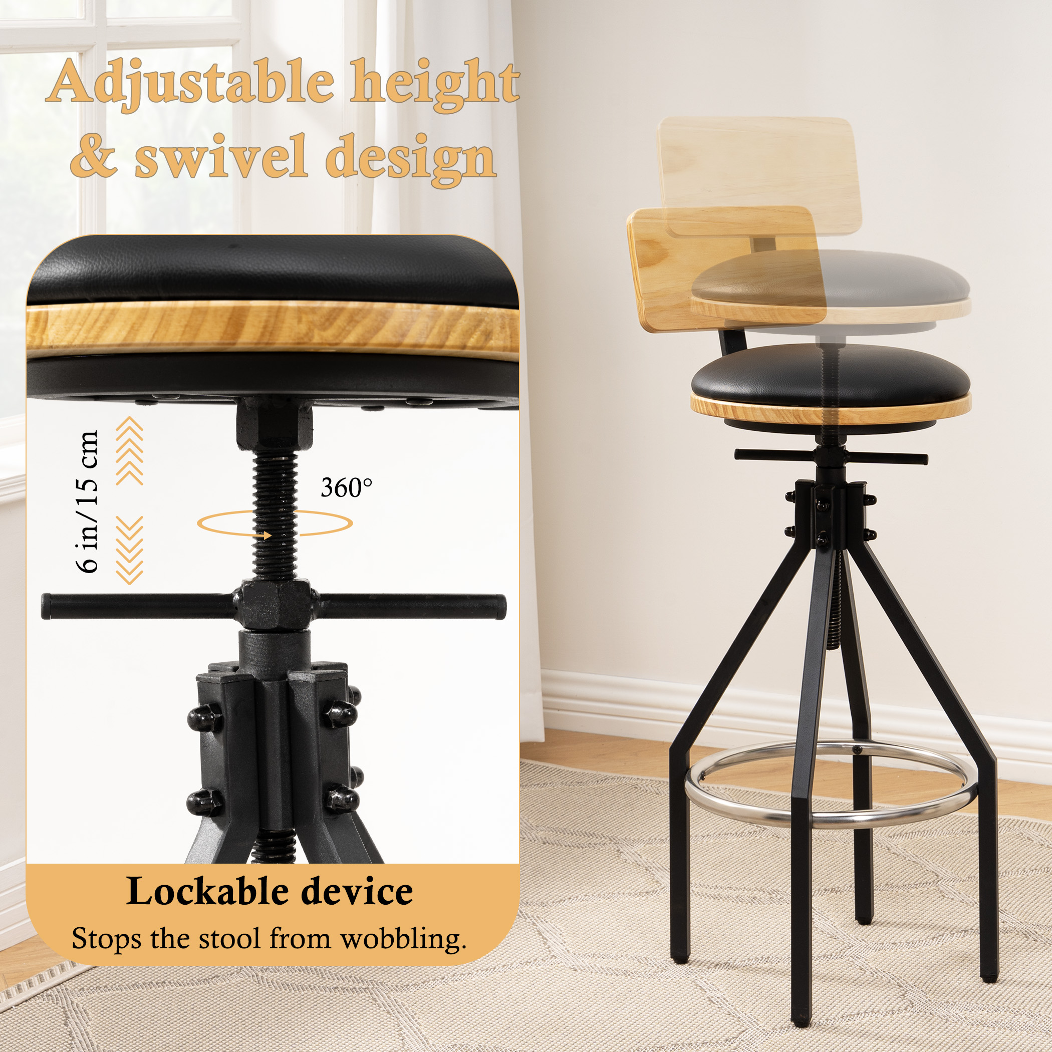 Height Adjustable & Stool Top Rotatable – Our bar stool features an adjustable height ranging from 27.5 in (70 cm) to 33 in (85 cm). You may raise or lower the stool by rotating the stool top to meet your needs. You may also change direction freely.