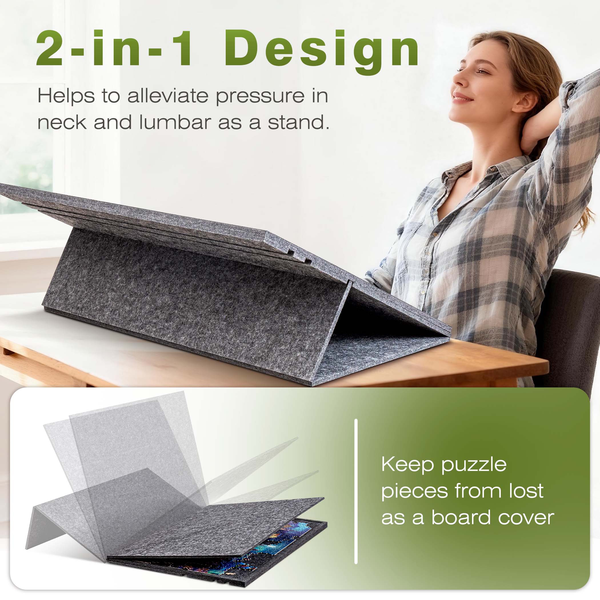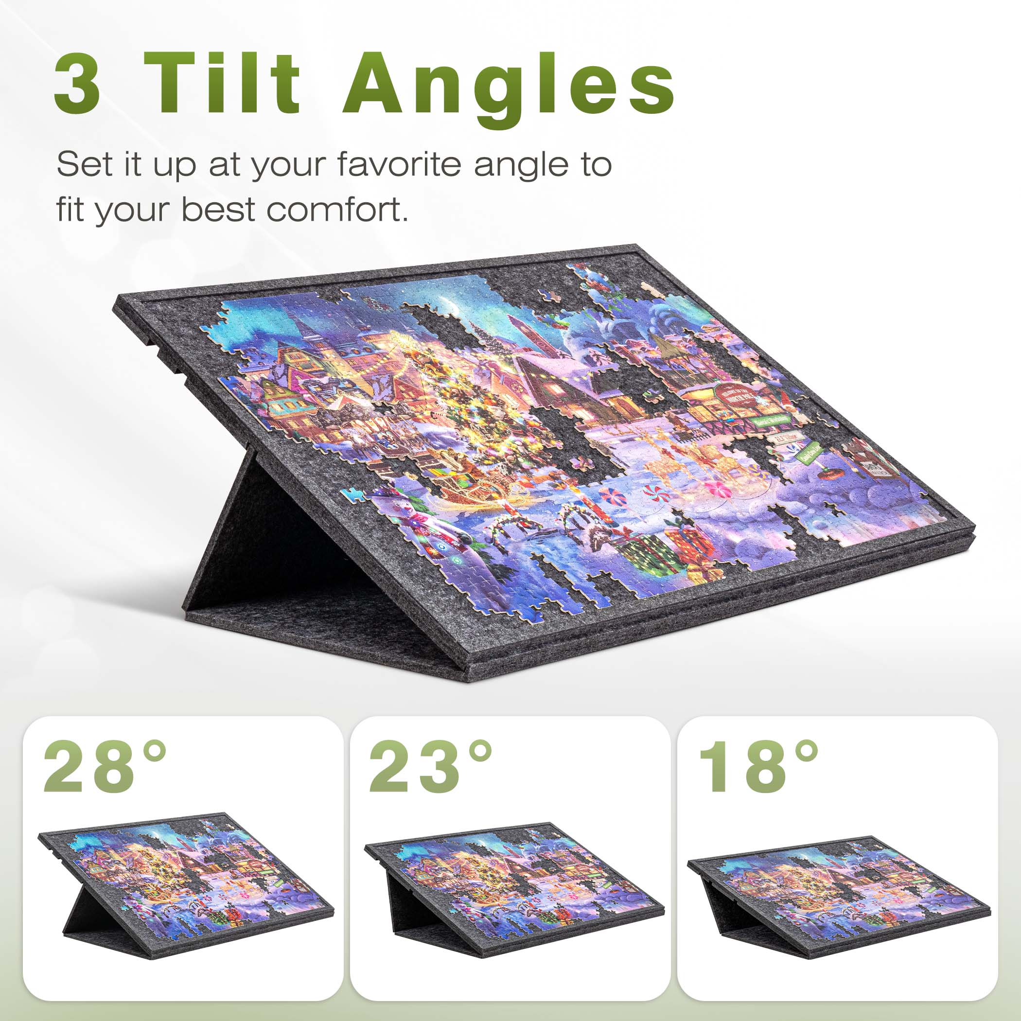 • 3 Angle Adjustable Puzzle Board – Featuring a 2-in-1 stand & cover, this felt puzzle board offers three adjustable angles (18°, 23°, and 28°). Pick what feels comfortable for you and reduce strain during long puzzle sessions. The textured surface provides just enough grip to prevent pieces from sliding — even at the steepest angle.
