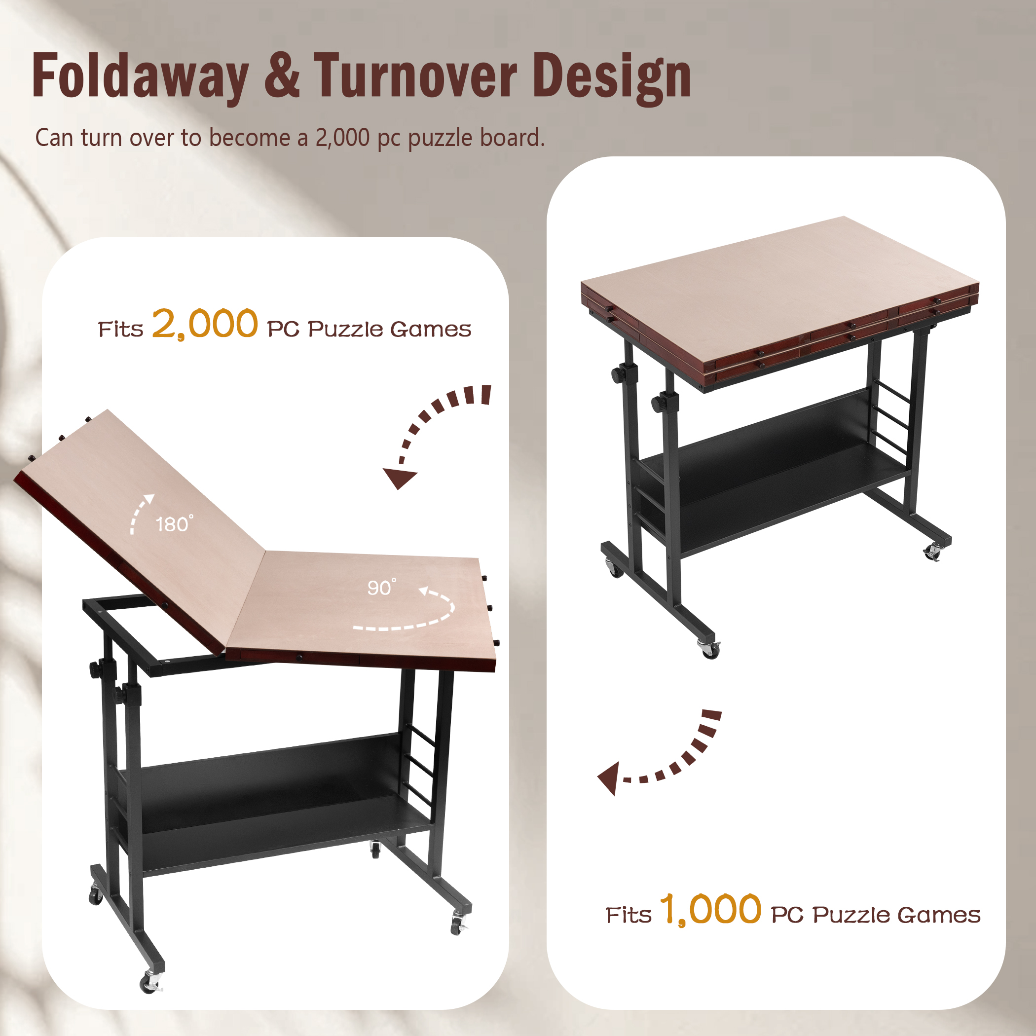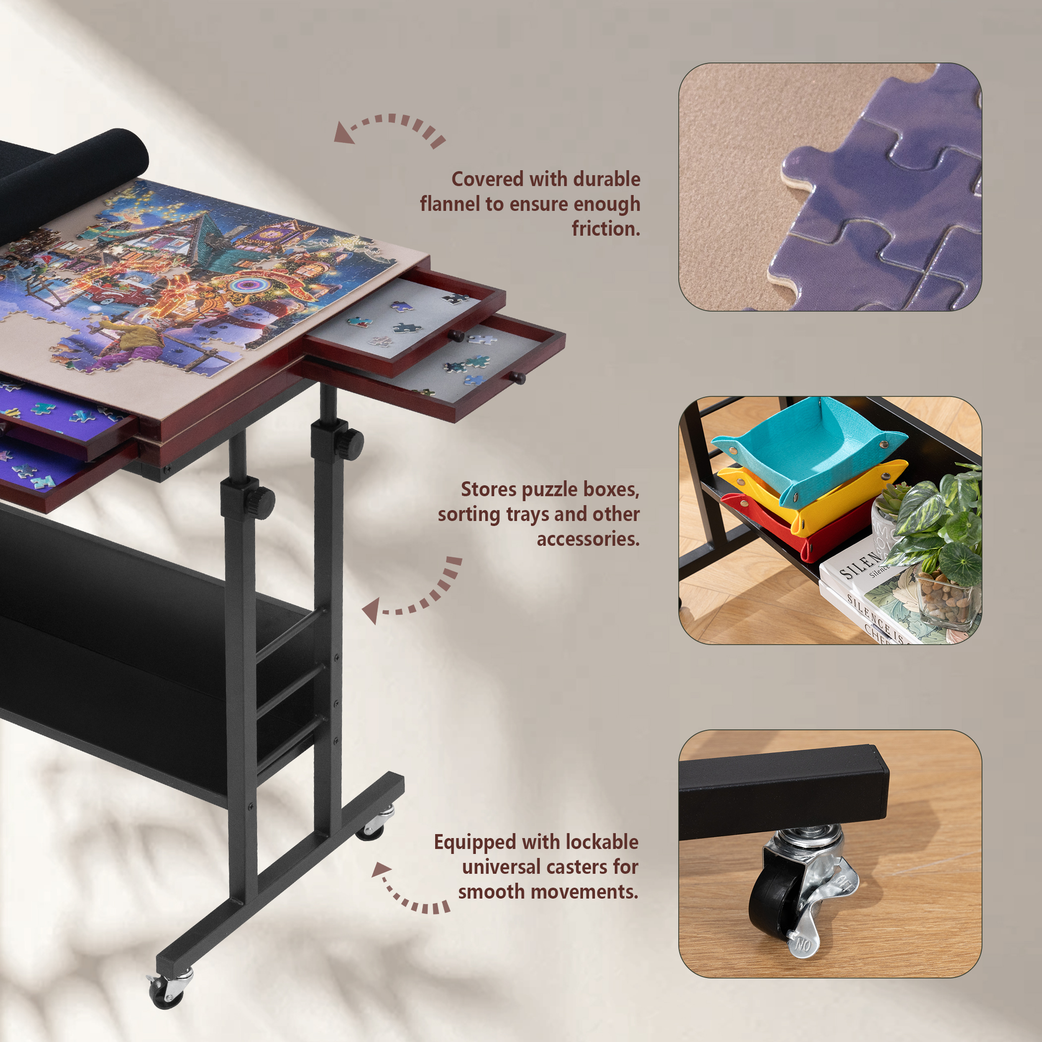 - 8 Drawers & 4 Casters – The inside of the puzzle board are 8 drawers enclosed which allow you to sort puzzle pieces by the color, pattern or shape and ensure you with higher game efficiency. The bottom shelf provides extra space to store your puzzle boxes and other puzzle accessories. Also equipped with 4 casters to make it easy to move the puzzle table anywhere you want, as well as immobilizes and stabilizes the table.
