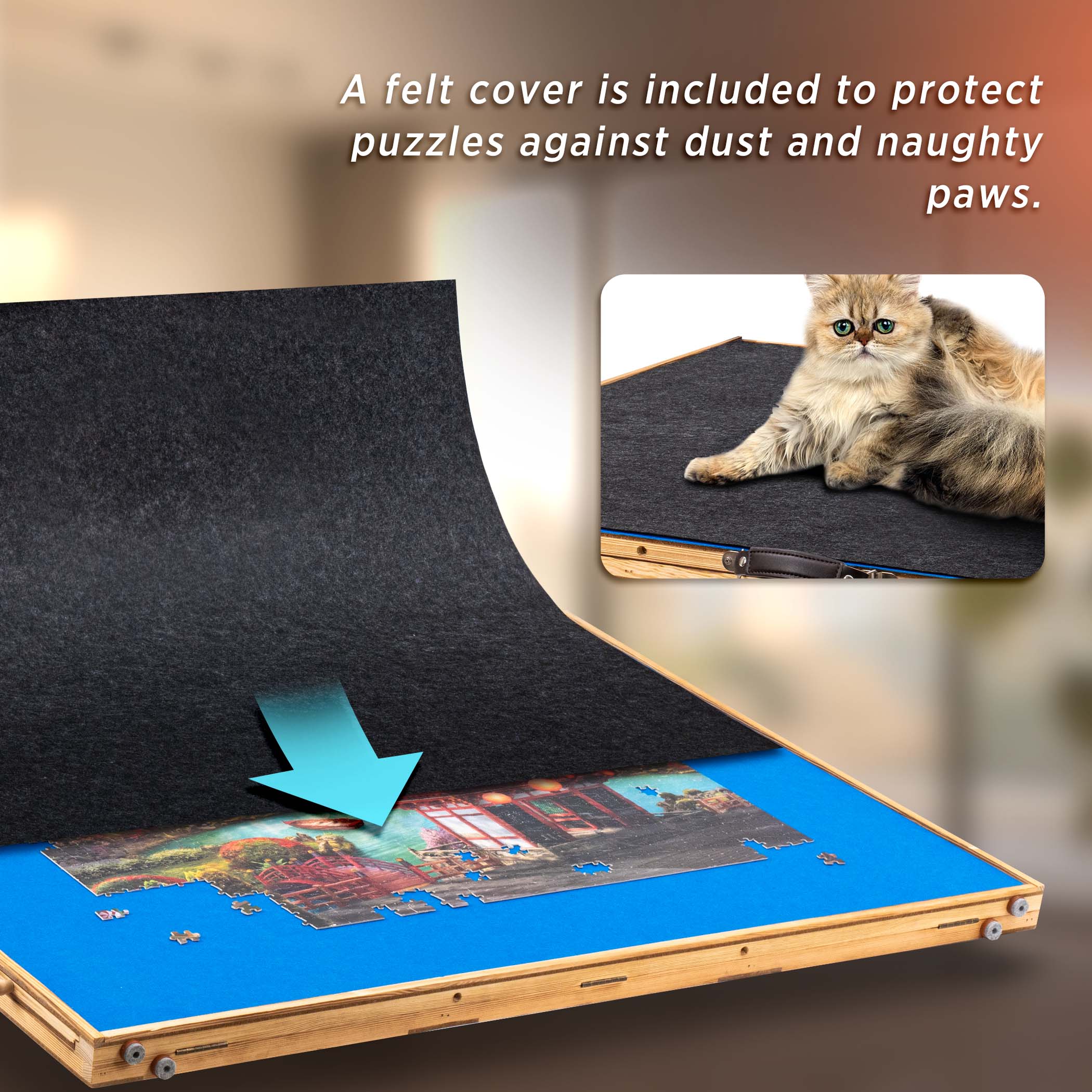 - Felt Protective Cover – The premium felt cover safeguards unfinished puzzles from dust and curious pets. Simply pause your game—store the covered board under sofas or beds until ready to resume. The wipe-clean surface ensures easy maintenance.