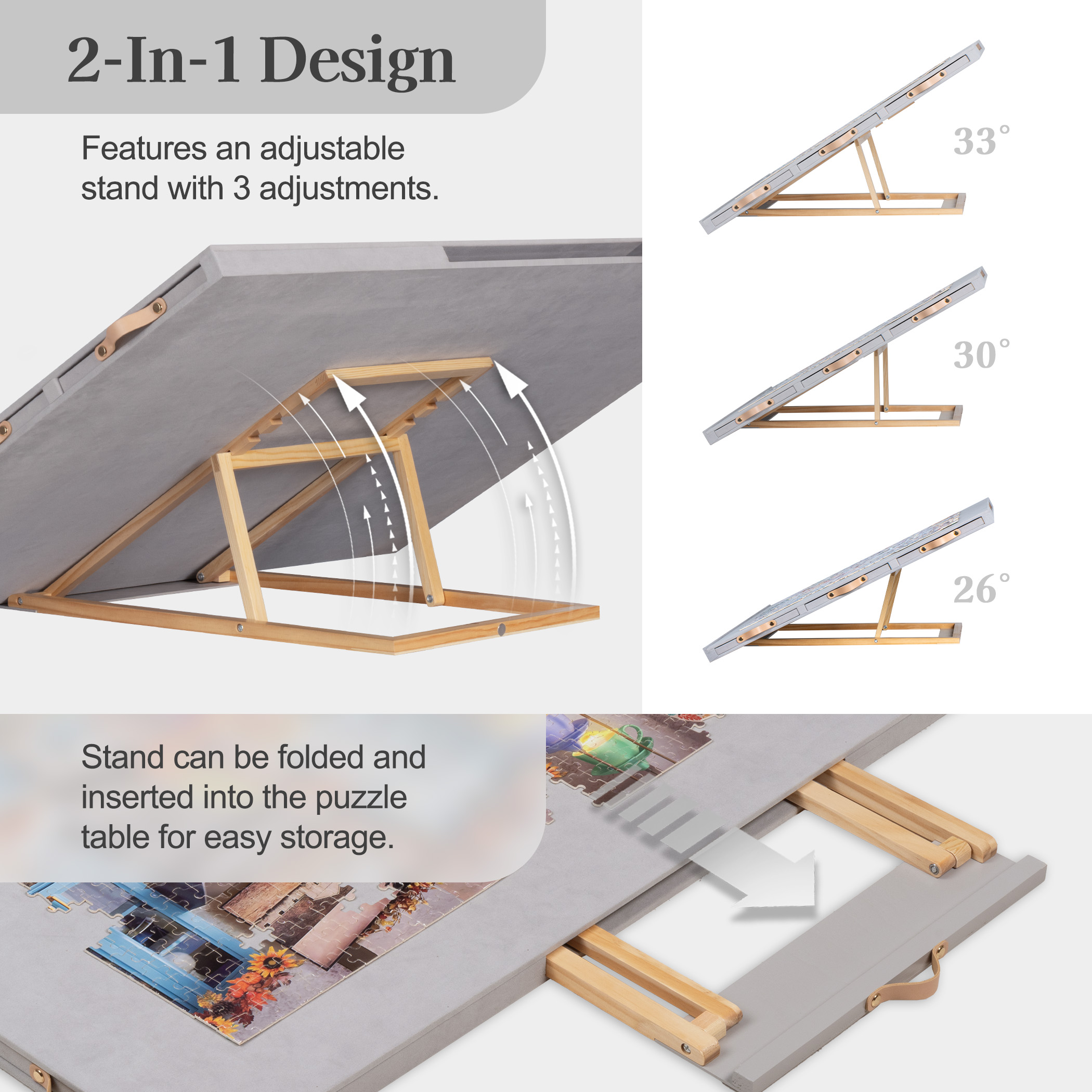 • 2-In-1 Built-in Stand – Our puzzle table features an ‌adjustable stand‌ with ‌3 tilt angles‌ (up to 30°), allowing you you to customize it for neck and back comfort while puzzling. When not in use, the stand tucks neatly inside the table for ‌hassle-free storage‌.