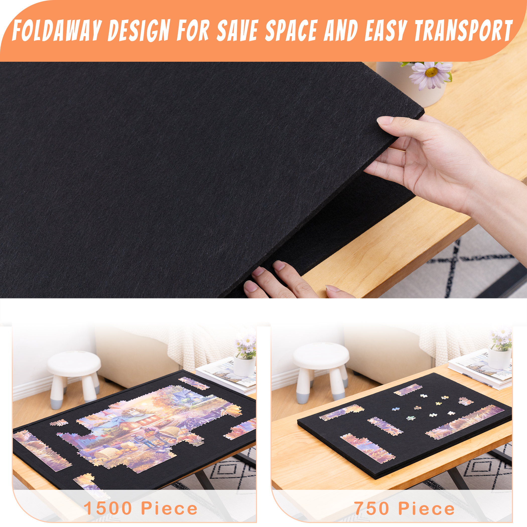 - Foldaway Puzzle Board – Our puzzle board is characterized by the foldable design which helps to save a large amount of space and thus ensures easy transport when taken out. A felt cover is also enclosed to secure your unfinished jigsaw puzzle game against dust and prevent naughty pets from messing with the pieces and causing unnecessary lost.