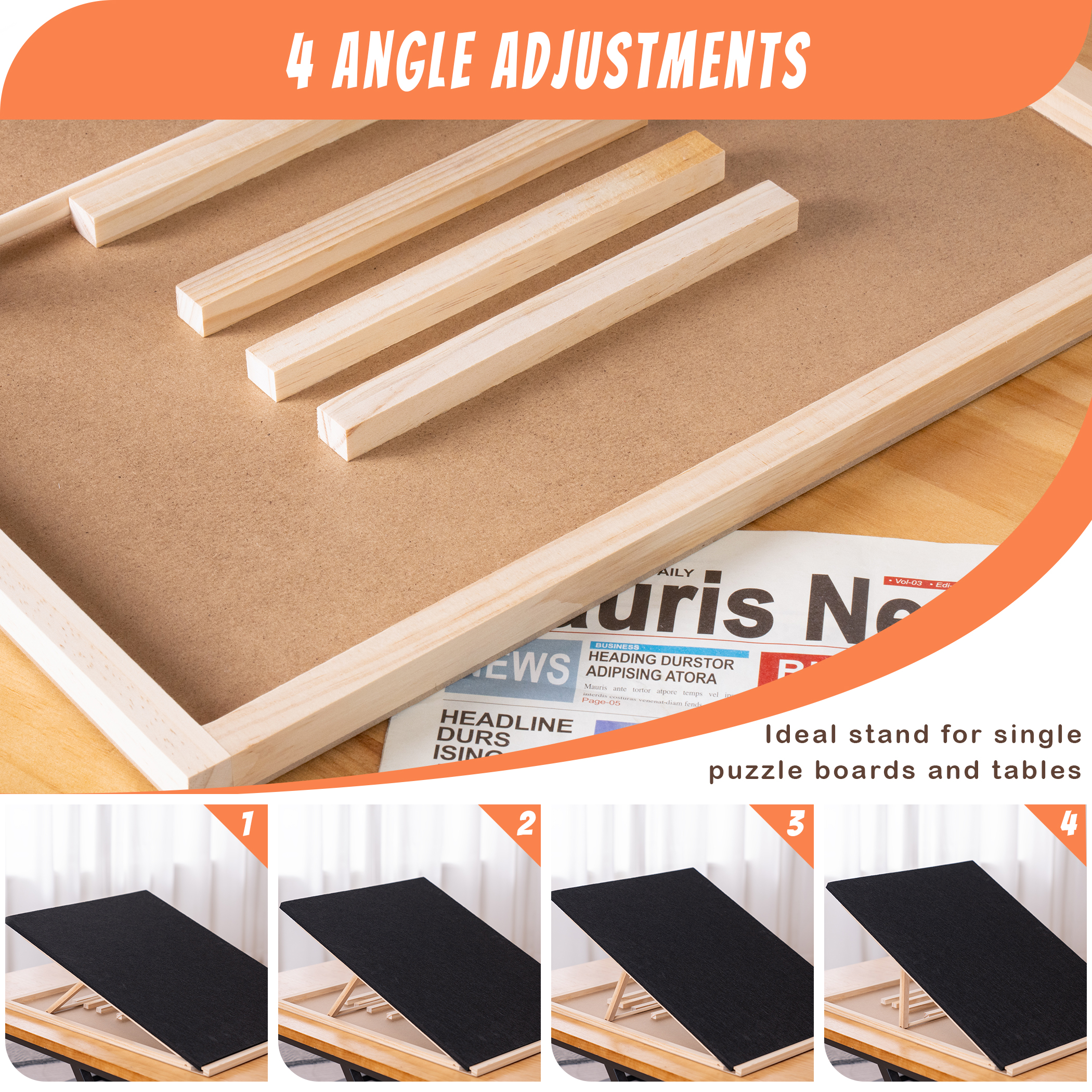 - Multiple Functions & Applications – Processed out of solid pinewood stand to ensure stability and durability. Features 4 angle adjustments to choose from and applies on multiple occasions to effectively alleviate fatigue in your neck after long hours of puzzling. Besides the enclosed corresponding puzzle board, the wooden stand also goes perfectly with puzzle boards in varying sizes and shapes.
