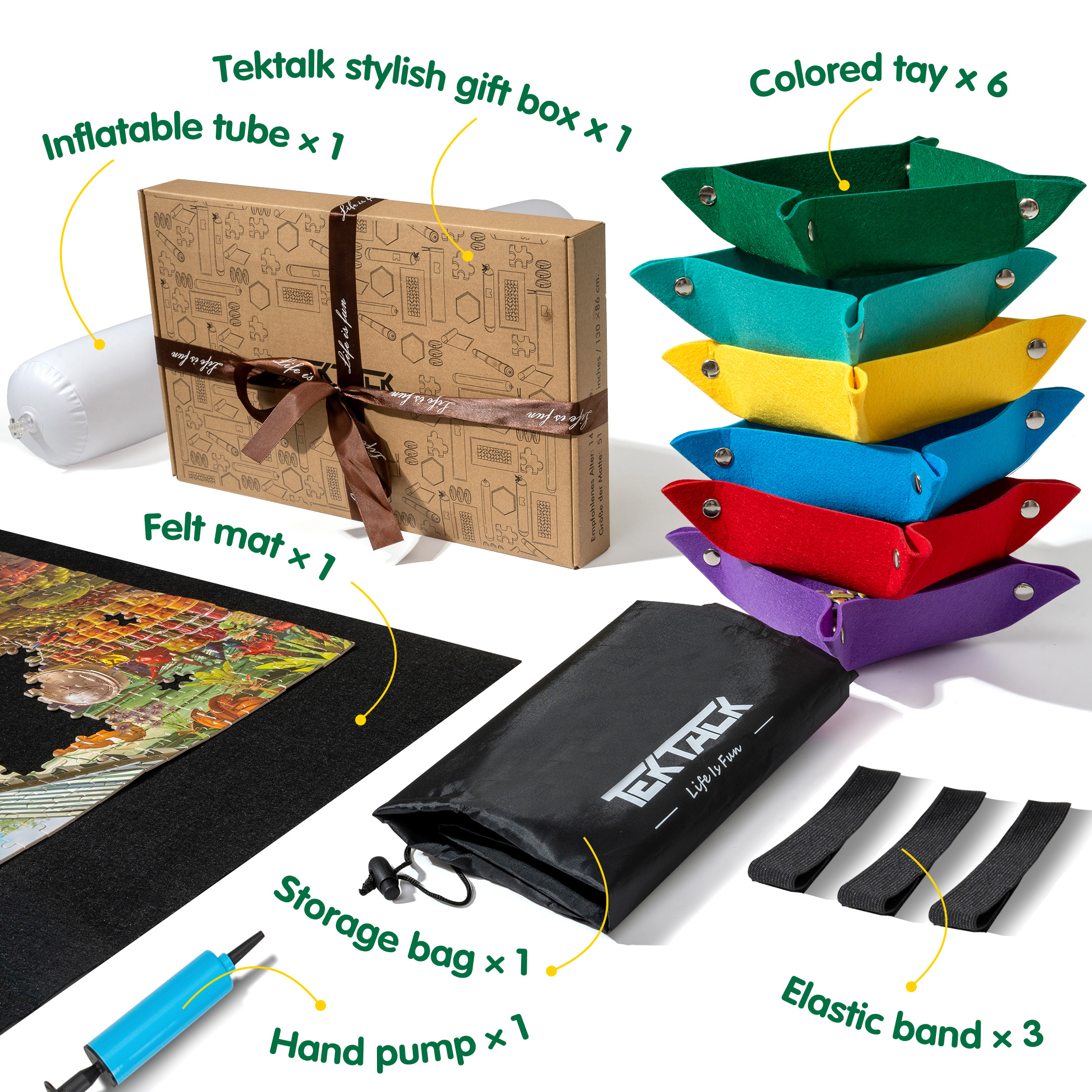 - Package Contents – Felt mat × 1, hand pump × 1, felt trays × 6, inflatable tube × 1, elastic band × 3, storage bag × 1. Exquisite present box makes it a perfect present for all ages. Please note that package includes no jigsaw puzzles.